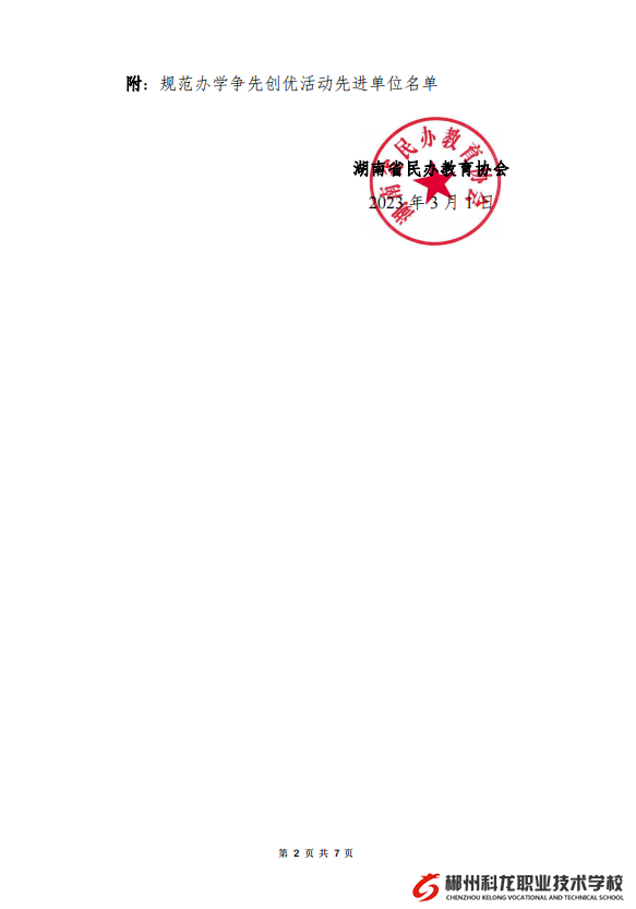 3月6日上午,湖南省民办教育协会2022年度会员代表大会在长沙隆重召开。湖南省民办教育协会开展的“规范办学争先创优”活动结果揭晓。我校经市民办教育协会初审、市教育局民办教育科复审,评选专家组终审,郴州市科龙职业技术学校获评湖南省民办教育协会“规范办学争先创优活动先进单位”称号,郴州市仅有1所中职学校获得此荣誉。