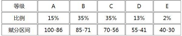 2.等级赋分办法。等级赋分以30分作为赋分起点,满分为100分。将考生每门再选科目考试的原始成绩从高到低划定为A、B、C、D、E五等,各等级人数所占比例分别为15%、35%、35%、13%和2%。转换基数为实际参加该再选科目考试并取得有效成绩的人数。转换时,将A至E等级内的考生原始成绩,依照等比例转换法则,分别转换到100~86分、85~71分、70~56分、55~41分、40~30分五个等级分数区间(具体等级比例和赋分区间见附件),根据转换公式计算,四舍五入得到考生的等级成绩。转换后的等级成绩一分一档,考生排序不变。