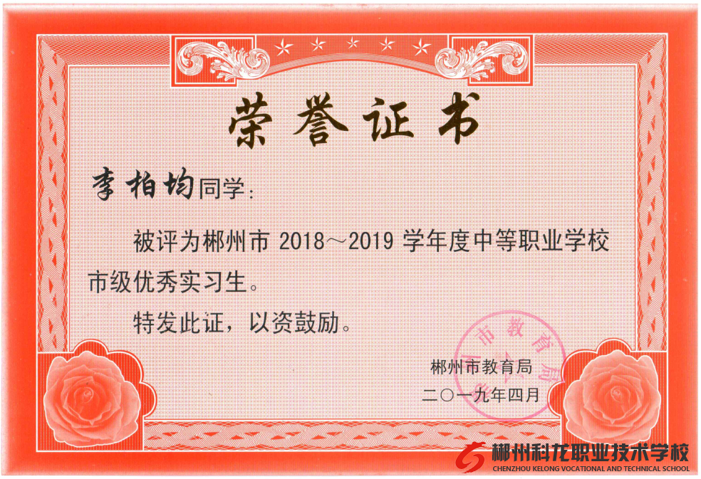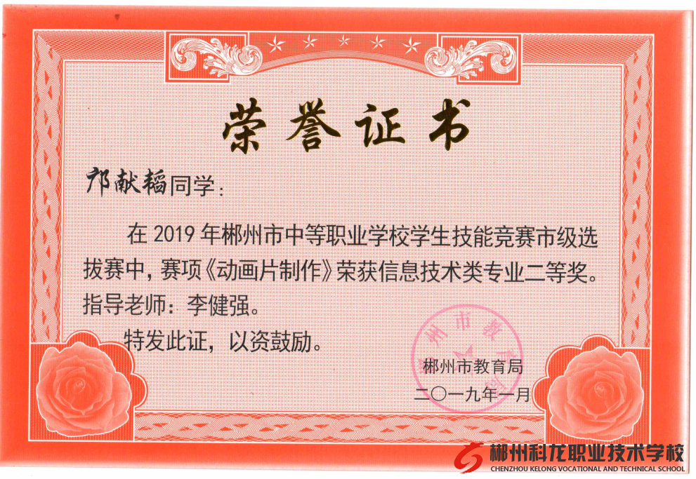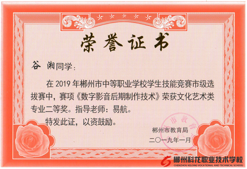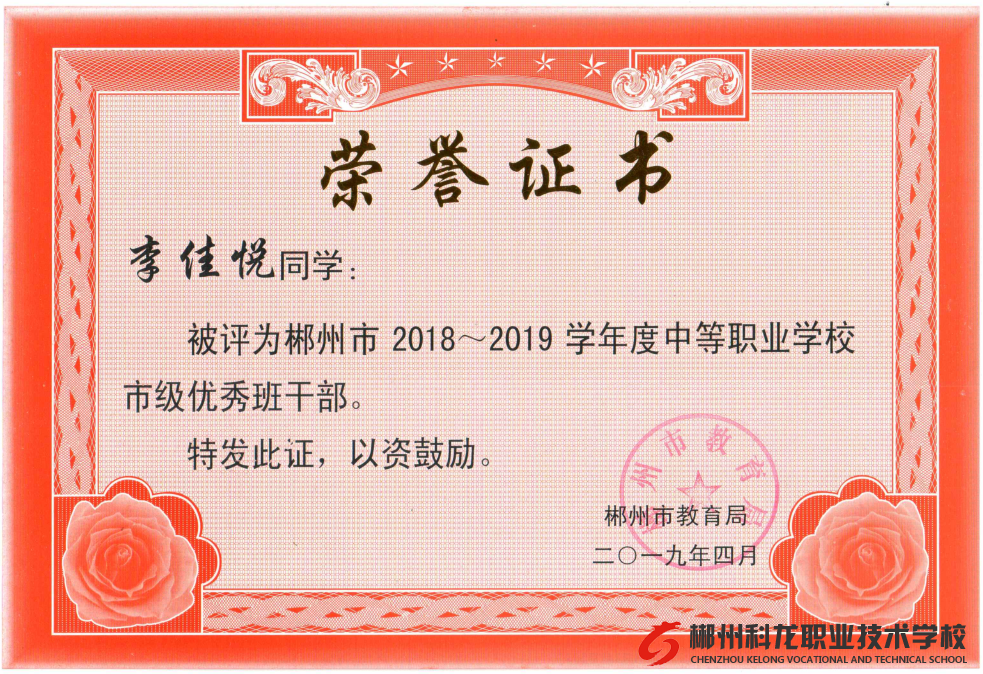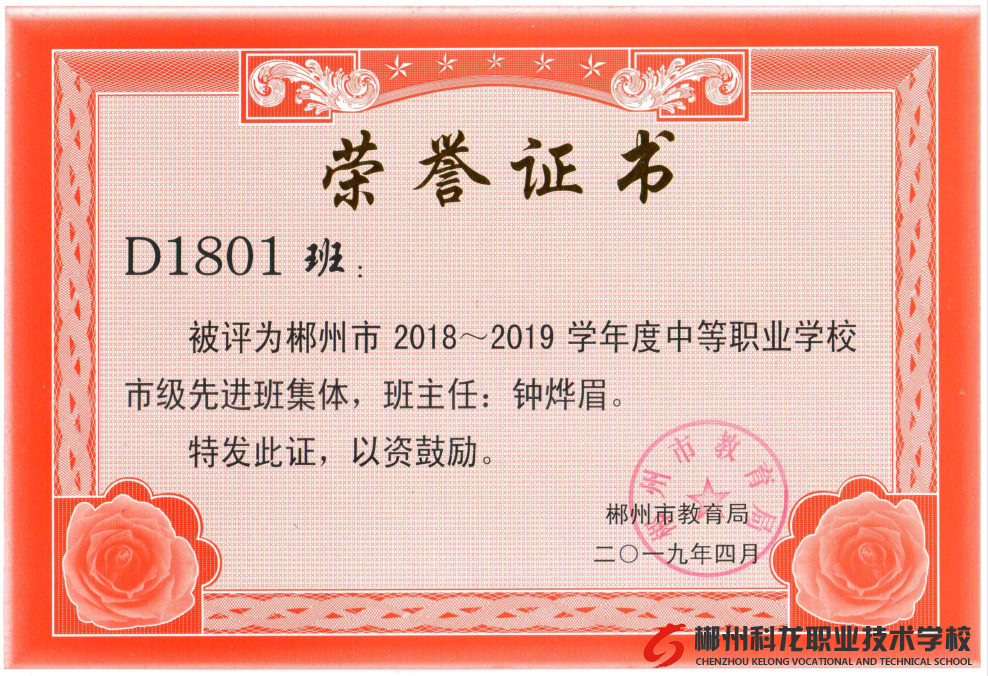 祝贺李嘉琪、赵美娟、李佳悦、李柏均、D1801班(班集体)、邝献韬、曹政、谷湘同学在2018—2019学年度表现突出,分别被评为市级三好学生、市级优秀班干部、市级优秀实习生、市级优秀班集体及在2019年郴州市中等职业学校技能竞赛市级选拔赛中,赛项《数字影音后期制作技术》、
